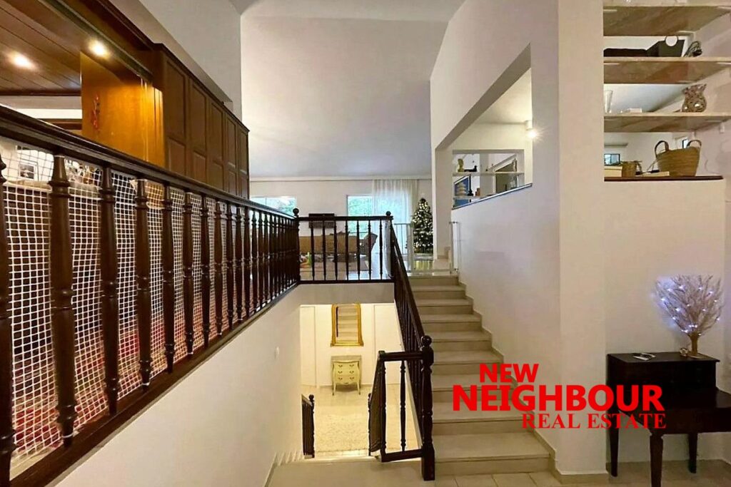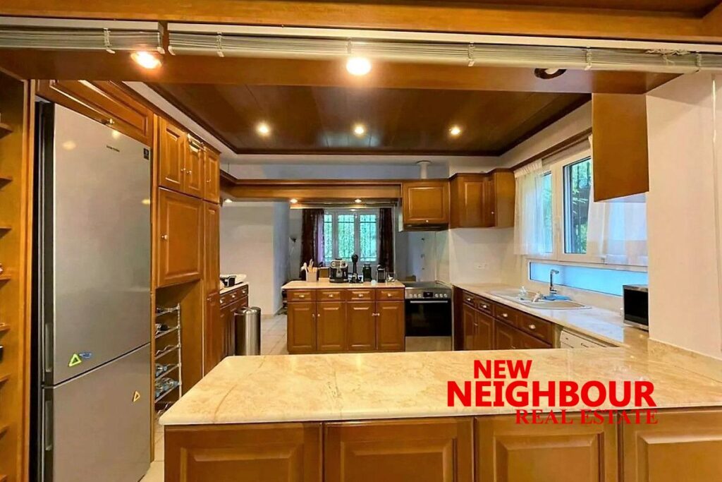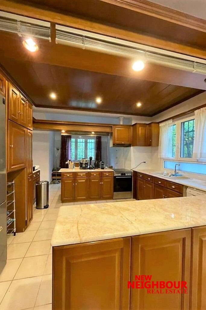 Πωλείται μονοκατοικία 380τμ σε επικλινές οικόπεδο 850τμ, στον Διόνυσο. Είναι κατασκευής 1989 και ανακαινισμένη το 2022. Αναπτύσσεται σε 3 επίπεδα, ημιυπόγειο – ισόγειο και 1ος όροφος. Στο ημιυπόγειο, το οποίο λόγω κλίσεως του εδάφους βρίσκεται στο επίπεδο ακριβώς του κήπου και της πισίνας περιλαμβάνει ανεξάρτητο ξενώνα 40τ.μ, καθιστικό, τζάκι, κουζίνα, δωμάτιο υπηρεσίας, λουτρό, θέση στάθμευσης τριών αυτοκινήτων, αποθηκευτικούς χώρους και λεβητοστάσιο. Στο ισόγειο έχουμε μεγάλο χώρο υποδοχής (100τ.μ), τραπεζαρία, ξεχωριστή γωνιά τζακιού, ανεξάρτητη εντυπωσιακή κουζίνα με εντοιχισμένες ηλεκτρικές συσκευές, καθημερινό καθιστικό, γραφείο, wc επισκεπτών και μεγάλη βεράντα απ όπου η θέα προς τον κήπο και την πισίνα καθώς και προς το απέναντι βουνό είναι μαγευτική. Στον 1ο όροφο βρίσκονται 4 υ/δ, εκ των οποίων το ένα master με en suite λουτρό, δύο ακόμα λουτρά και ατομική βεράντα για το κάθε υπνοδωμάτιο. Αυτή η ιδιαίτερης αρχιτεκτονικής μονοκατοικία διαθέτει αυτόνομη ενδοδαπέδια θέρμανση πετρελαίου, τζάκι, boiler, κλιματισμό, εσωτερική σκάλα, μεγάλες βεράντες με απίστευτη θέα σε βουνό, θάλασσα και Εύβοια, , κουφώματα αλουμινίου και διπλά τζάμια, σίτες, τέντες, νυχτερινό ρεύμα, δορυφορική κεραία, playroom, κήπο 600τμ με Bbq 10 ατόμων, πισίνα 10μ με βάθος 3μ, συναγερμό, πόρτα ασφαλείας, μεγάλες αποθήκες και κλειστό πάρκινγκ 2 -3 αυτοκινήτων. Είναι προσόψεως, διαμπερής με βορειοανατολικό προσανατολισμό και ενεργειακή κλάση Β. τιμή 700.000€