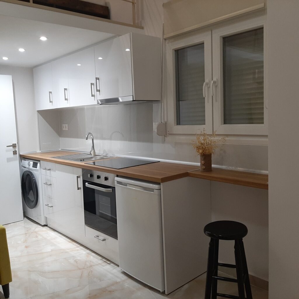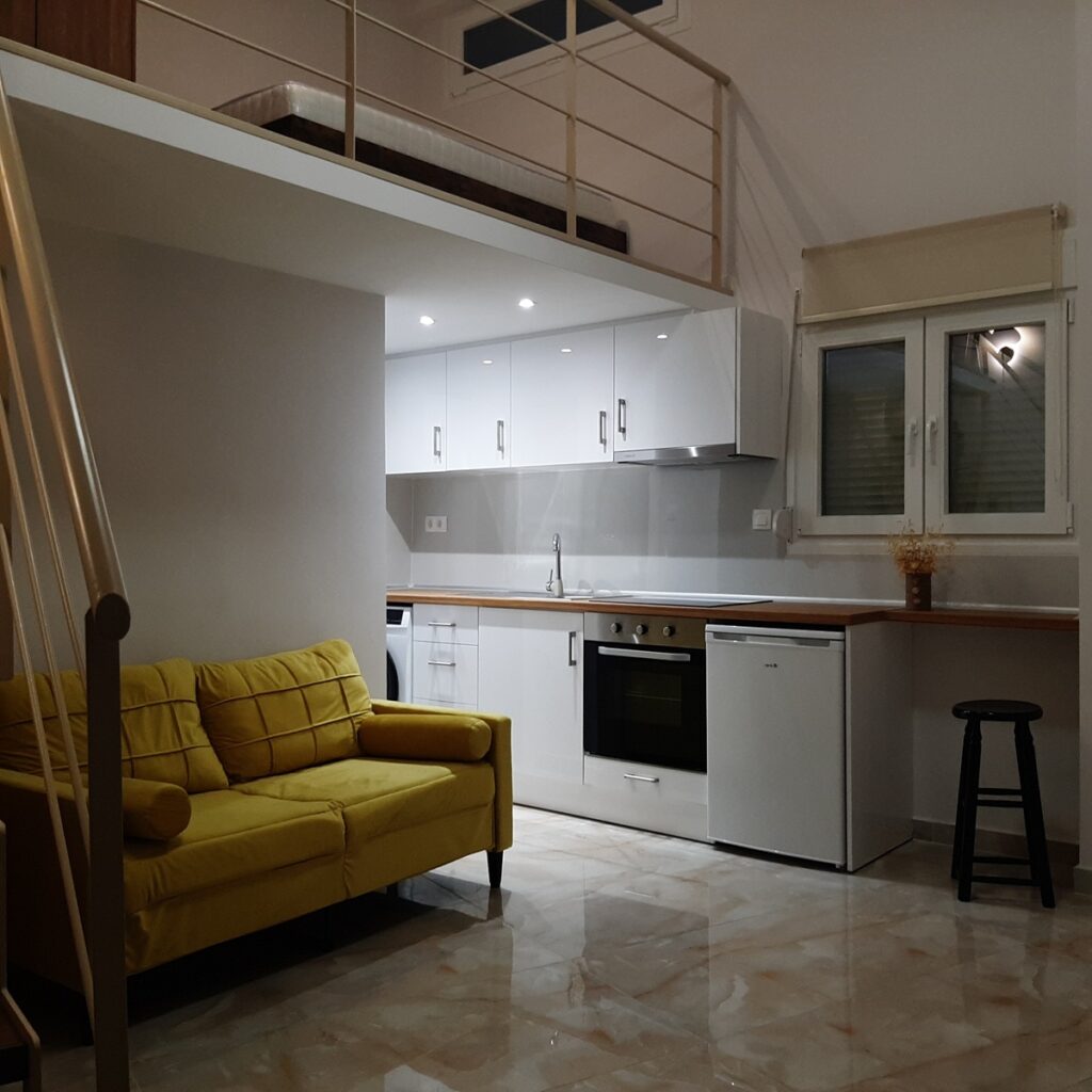εχει σαλοκουζινα και μπανιο στον κατω χωρο και στον επανω χωρο ειναι το υπνοδωματιο , με 1 a /c ( 12.000 btu ) θερμανσης – ψυξης ,