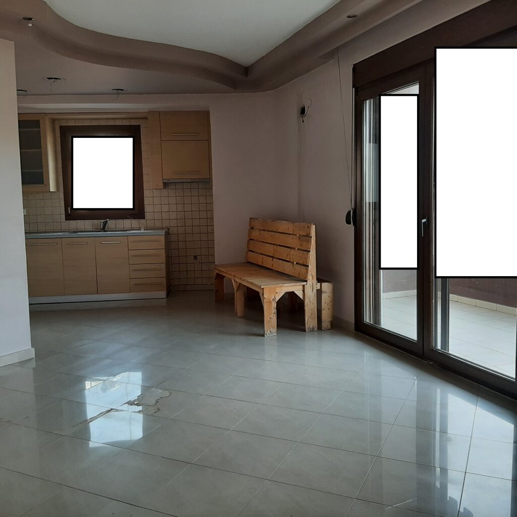 το δαπεδο ειναι πλακακι , με κουφωματα pvc ανακλησης σε απομιμηση ξυλου , διαθετει θωρακισμενη πορτα , εχει τεντες ,