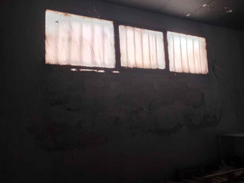 εχει σιδερενια πορτα , με παραθυρα σε ολο το μηκος της αποθηκης ,
