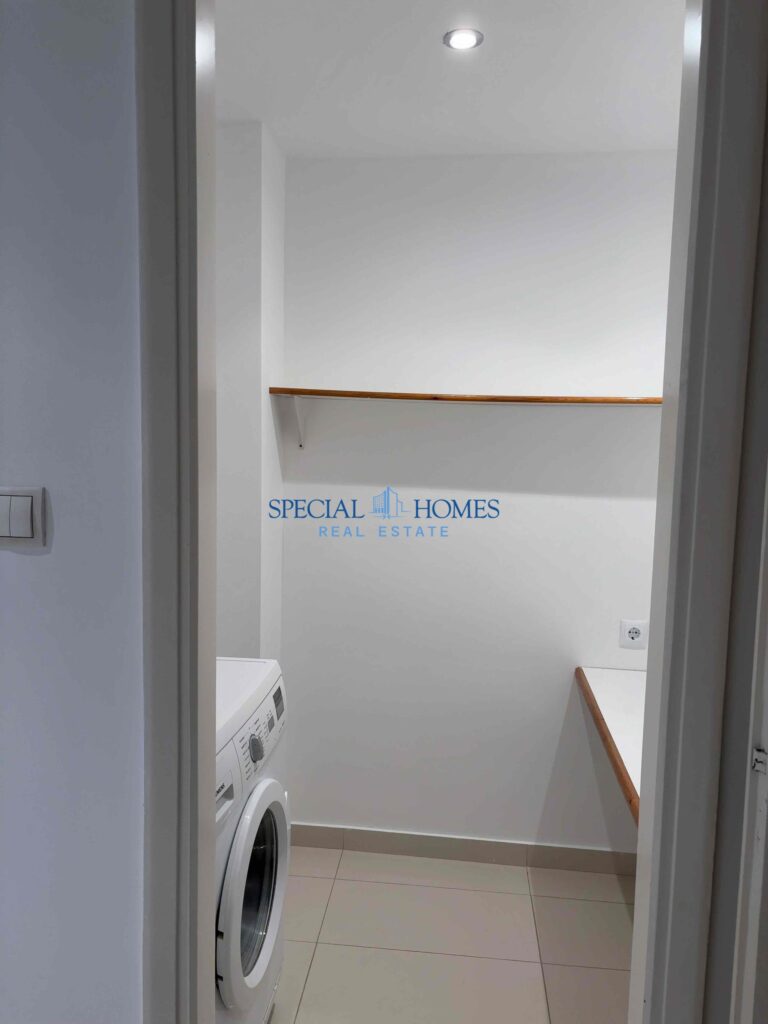 Στο εσωτερικό του διαθέτει μεγάλο κύριο χώρο (ξύλινα δάπεδα Iroko), πλήρως επιπλωμένη κουζίνα με εντοιχισμένες ηλεκτρικές συσκευές siemens και μεγάλη βεράντα (12τ.μ.) στην πρόσοψη με μικρή εξωτερική αποθήκη. Διαθέτει ακόμη δύο ευρύχωρα δωμάτια καλυμμένα επίσης με ξύλινα δάπεδα (Iroko), διαθέτει εντοιχισμένες ντουλάπες και έχει πρόσβαση σε μπαλκόνι. Ένα μικρό βοηθητικό δωμάτιο/αποθήκη, με πλυντήριο ρούχων, βρίσκεται επίσης εντός του διαμερίσματος. Τα δύο Λουτρά, ένα ευρύχωρο με μπανιέρα και ντους, καθώς και ένα W.C. επισκεπτών με ντους, είναι ιδιαίτερα καλά εξοπλισμένα, με δυνατότητα εξυπηρέτησης ατόμων με ειδικές ανάγκες.