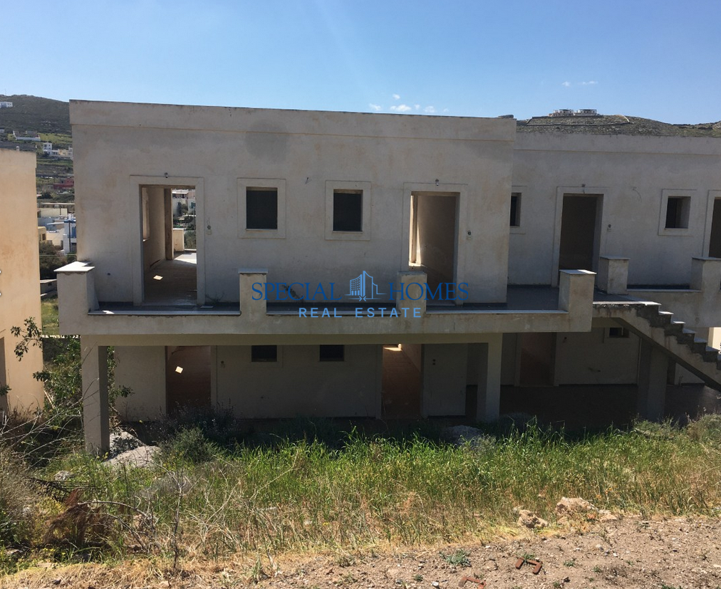 Συγκρότημα δύο ημιτελών διώροφων κτηρίων κατοικιών συνολικής επιφάνειας 601 τ.μ. επί οικοπέδου 895 τ.μ. Κτήριο Α: Eπιφάνειας 408 τ.μ. (περιλαμβάνει 8 studios, 4 ανά επίπεδο): υπόγειος αποθηκευτικός χώρος 165 τ.μ., ισόγειο 122 τ.μ. και Α’ όροφο 122 τ.μ. Κτήριο Β: Επιφάνειας 193 τ.μ. (περιλαμβάνει 4 studios & χώρο υποδοχής): ισόγειο 100τ.μ. & Α’ όροφος 93 τ.μ.