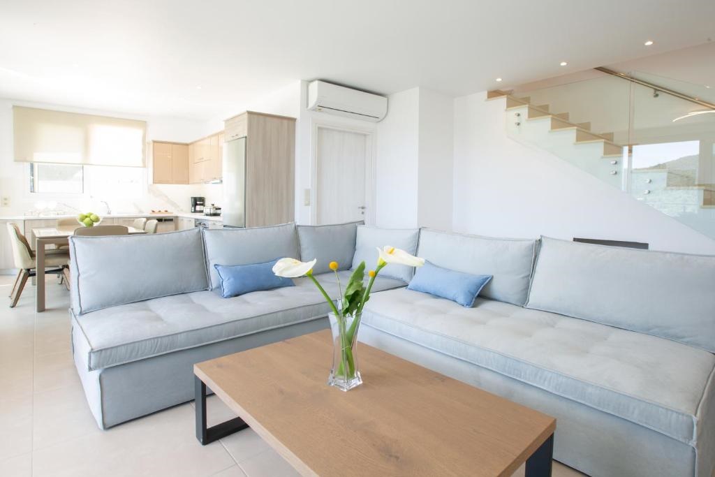 Λεπτομέρειες: Κάθε Βίλα είναι ανεξάρτητη και παρέχει ιδιωτικότητα. Έχουν επιφάνεια 120τμ έκαστην και συγκεκριμένα στο ισόγειο διαθέτουν σύγχρονη κουζίνα και σαλόνι με απευθείας πρόσβαση στην βεράντα και την μεγάλη πισίνα υπερχείλισης καθώς και ένα υπνοδωμάτιο με δικό του μπάνιο. Στον όροφο υπάρχουν άλλα δύο υπνοδωμάτια με δικά τους μπάνια και βεράντες με πανοραμική θέα τον κόλπο του Βλυχού, το Νυδρί και τον Σκορπιό.