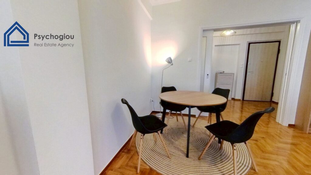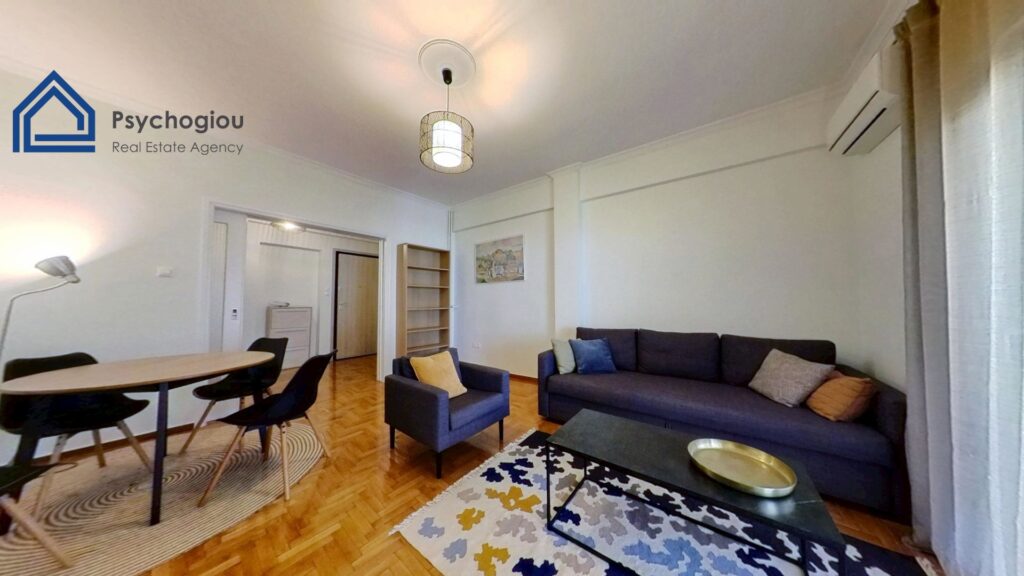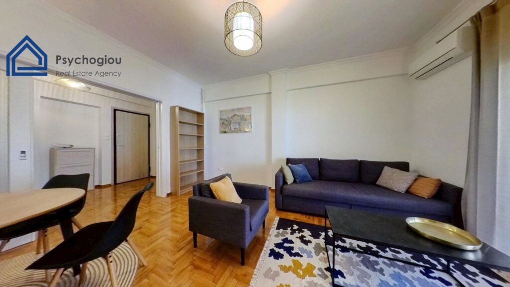 Το εσωτερικό του διαμερίσματος διαθέτει ένα ευρύχωρο και φωτεινό σαλόνι που συνδυάζεται με την τραπεζαρία, με παρκέ δρυός και μεγάλο μπαλκόνι 15 τ.μ. που προσφέρει υπέροχη θέα στο αστικό τοπίο. Η κουζίνα είναι πλήρως εξοπλισμένη με σύγχρονες ηλεκτρικές συσκευές και διαθέτει μοντέρνα γκρι ντουλάπια και αρκετό χώρο αποθήκευσης.